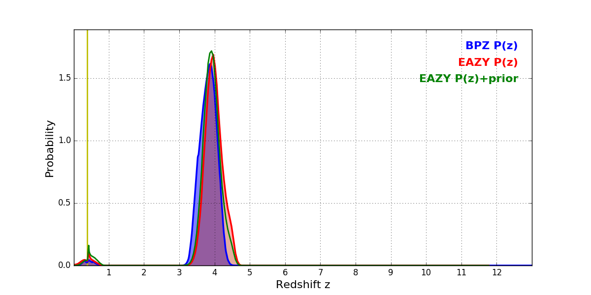 In P(z) plots: Yellow lines mark the cluster redshift z = 0.390,