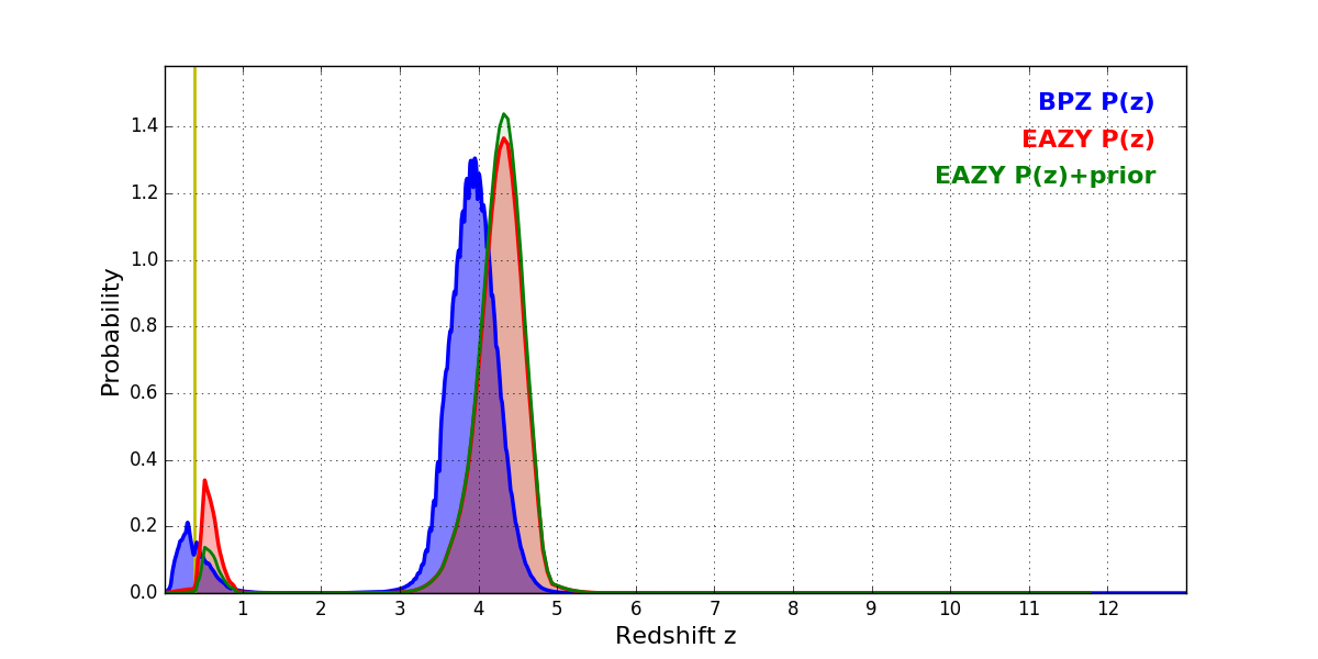 In P(z) plots: Yellow lines mark the cluster redshift z = 0.390,