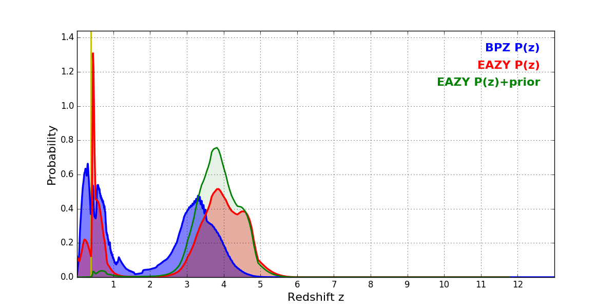 In P(z) plots: Yellow lines mark the cluster redshift z = 0.390,