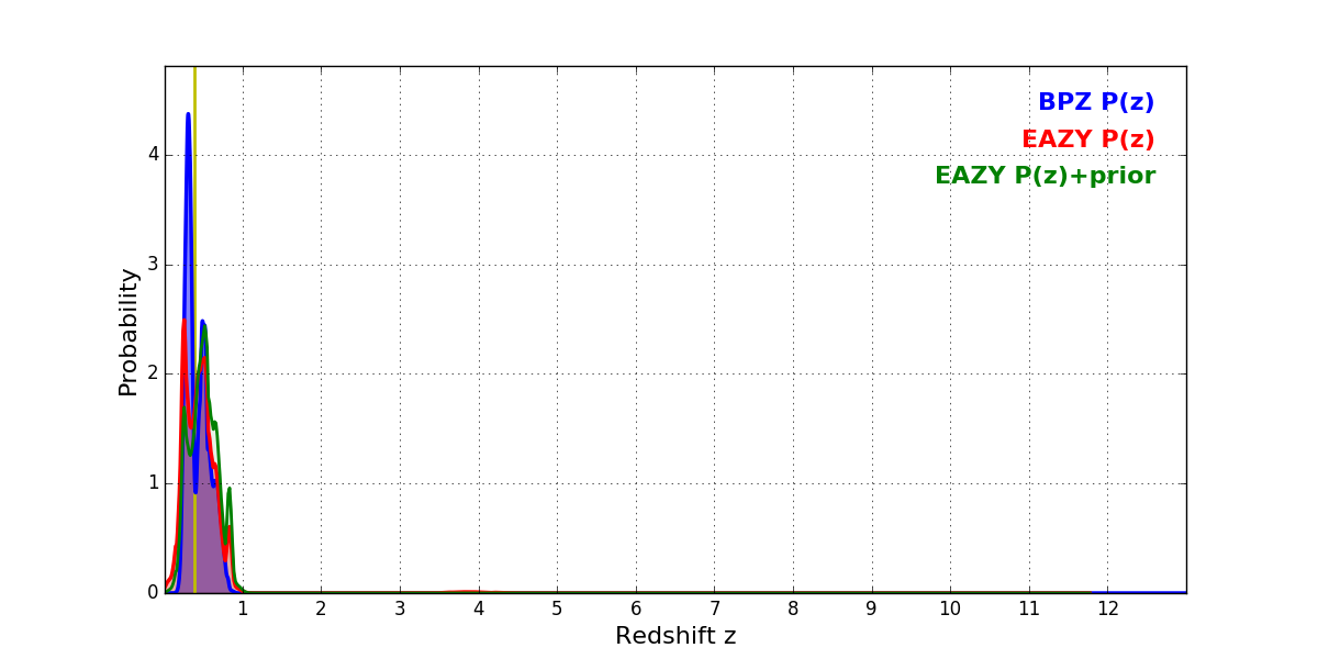 In P(z) plots: Yellow lines mark the cluster redshift z = 0.390,
