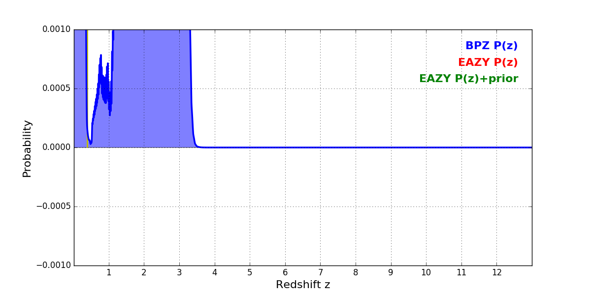 In P(z) plots: Yellow lines mark the cluster redshift z = 0.390,