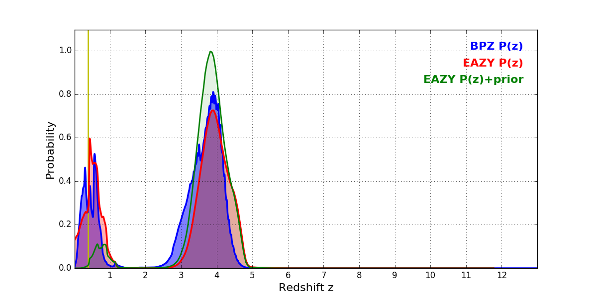 In P(z) plots: Yellow lines mark the cluster redshift z = 0.390,