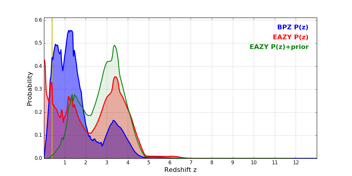 In P(z) plots: Yellow lines mark the cluster redshift z = 0.390,