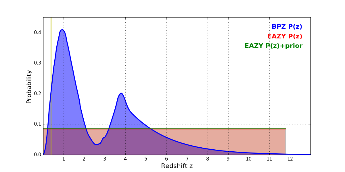 In P(z) plots: Yellow lines mark the cluster redshift z = 0.390,