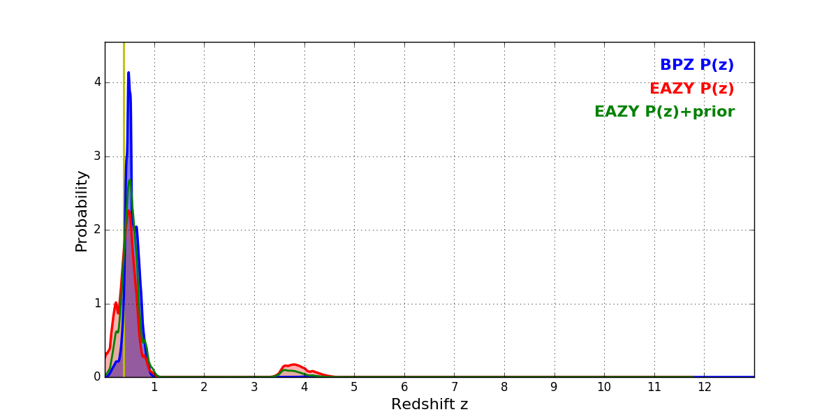 In P(z) plots: Yellow lines mark the cluster redshift z = 0.390,