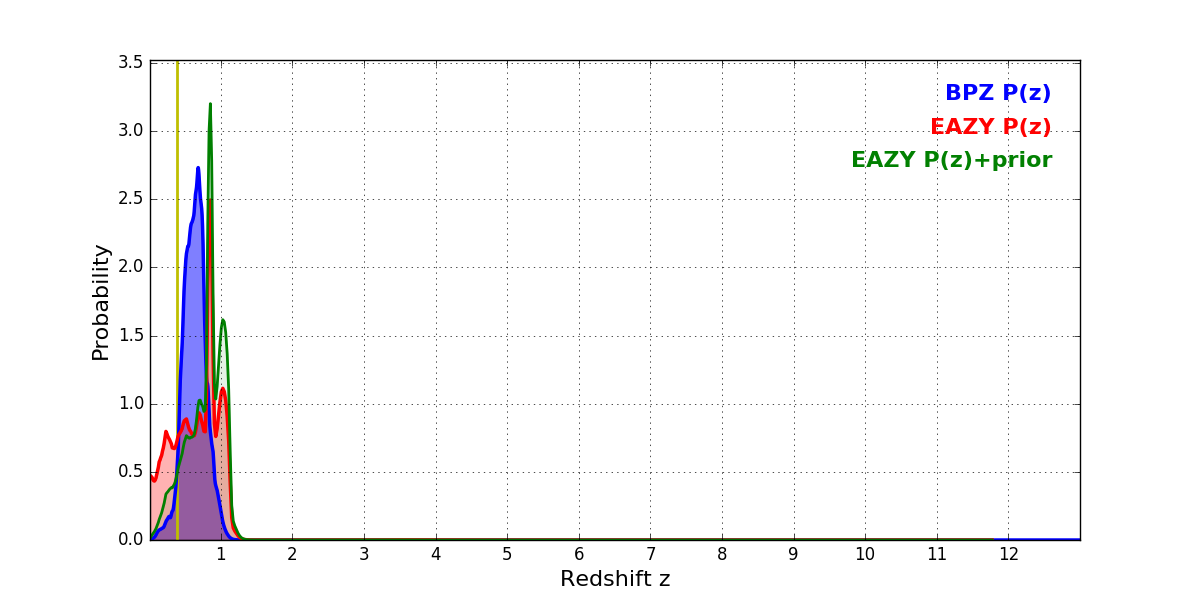 In P(z) plots: Yellow lines mark the cluster redshift z = 0.390,