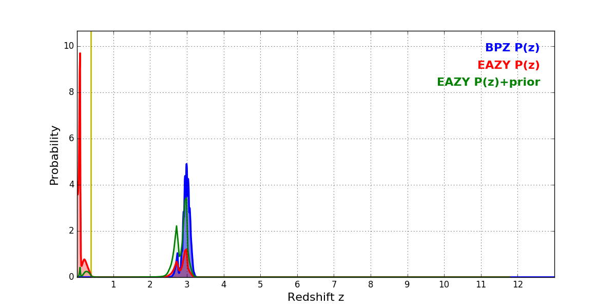 In P(z) plots: Yellow lines mark the cluster redshift z = 0.390,