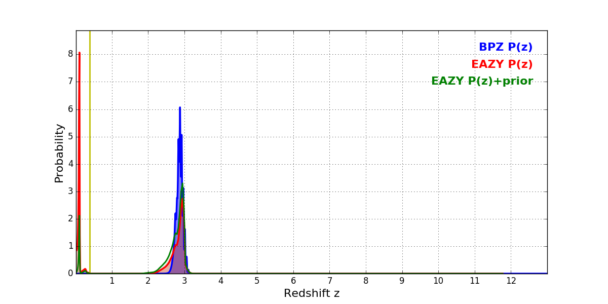 In P(z) plots: Yellow lines mark the cluster redshift z = 0.390,