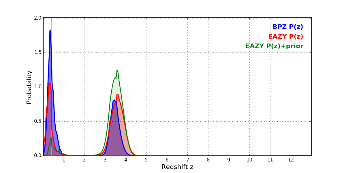 In P(z) plots: Yellow lines mark the cluster redshift z = 0.390,