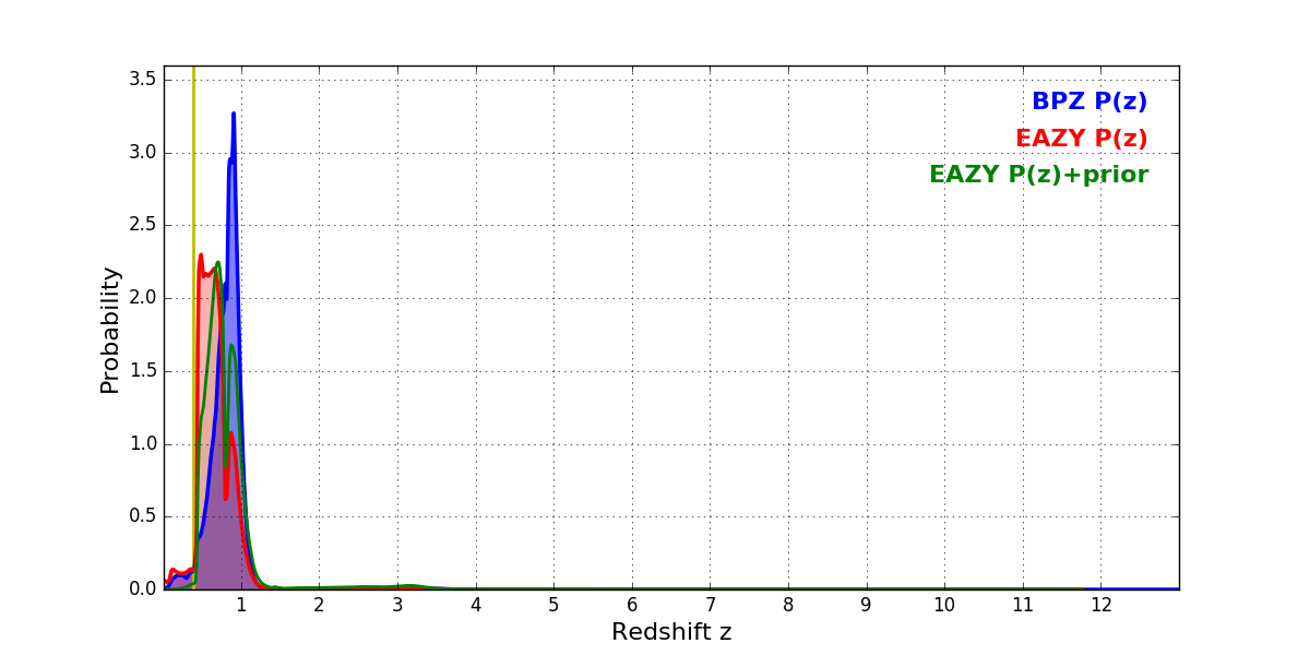 In P(z) plots: Yellow lines mark the cluster redshift z = 0.390,