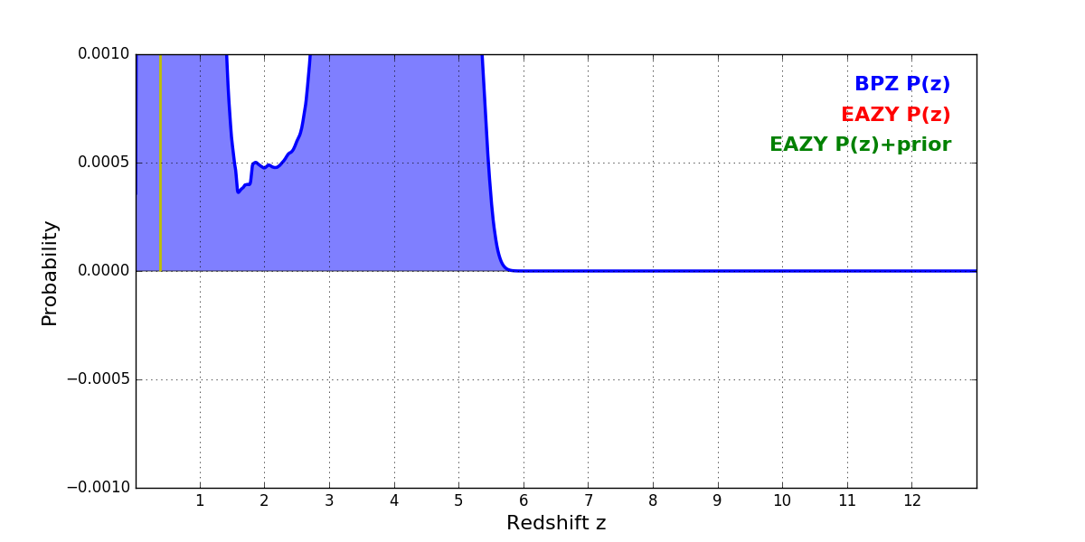 In P(z) plots: Yellow lines mark the cluster redshift z = 0.390,