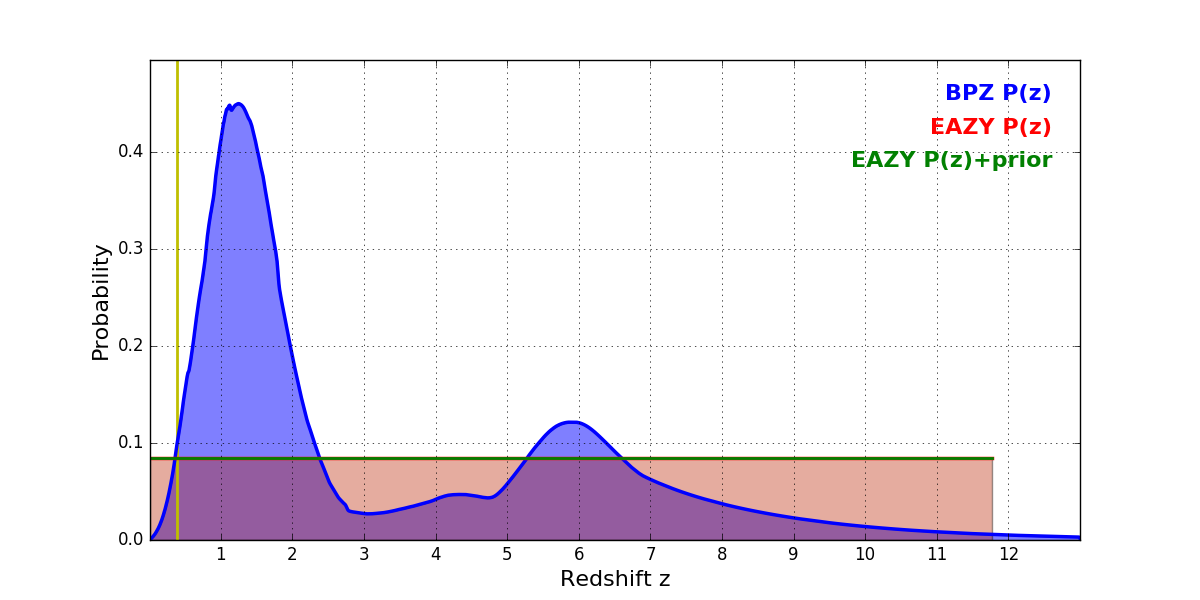 In P(z) plots: Yellow lines mark the cluster redshift z = 0.390,