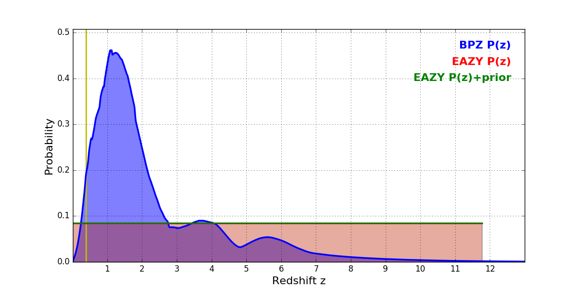 In P(z) plots: Yellow lines mark the cluster redshift z = 0.390,
