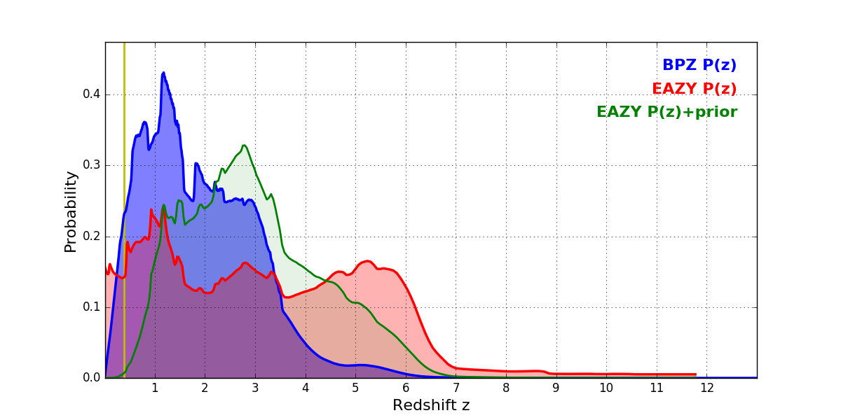 In P(z) plots: Yellow lines mark the cluster redshift z = 0.390,