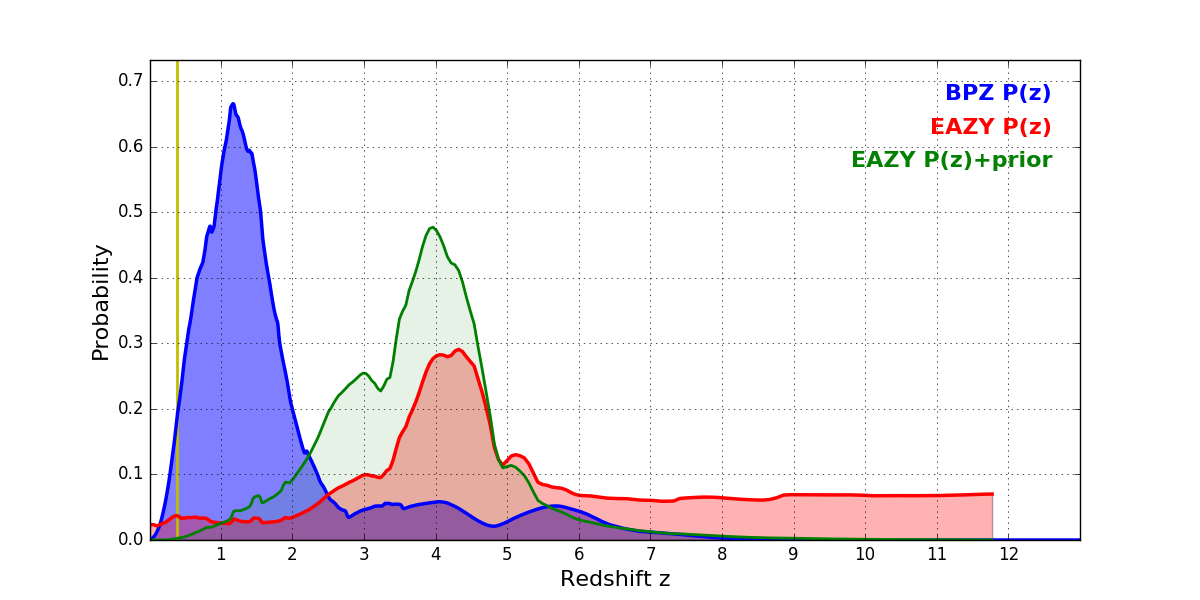 In P(z) plots: Yellow lines mark the cluster redshift z = 0.390,
