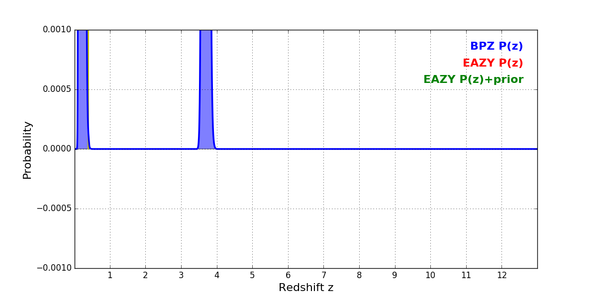In P(z) plots: Yellow lines mark the cluster redshift z = 0.390,