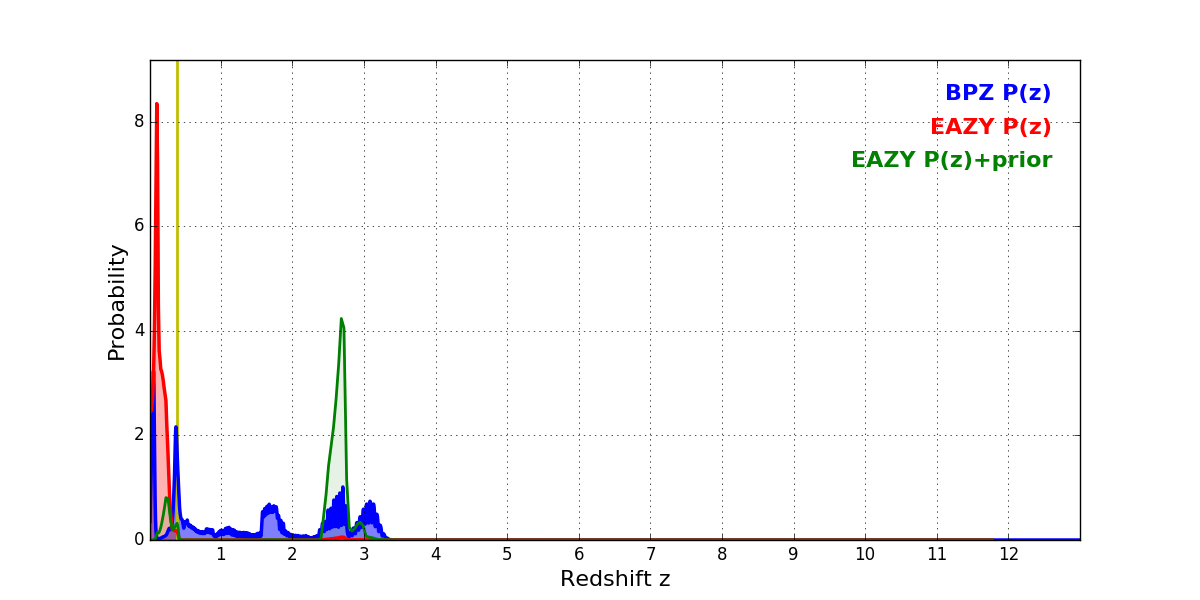 In P(z) plots: Yellow lines mark the cluster redshift z = 0.390,