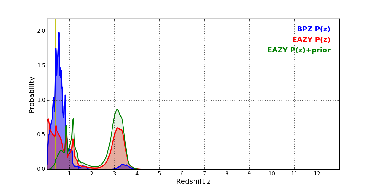 In P(z) plots: Yellow lines mark the cluster redshift z = 0.390,