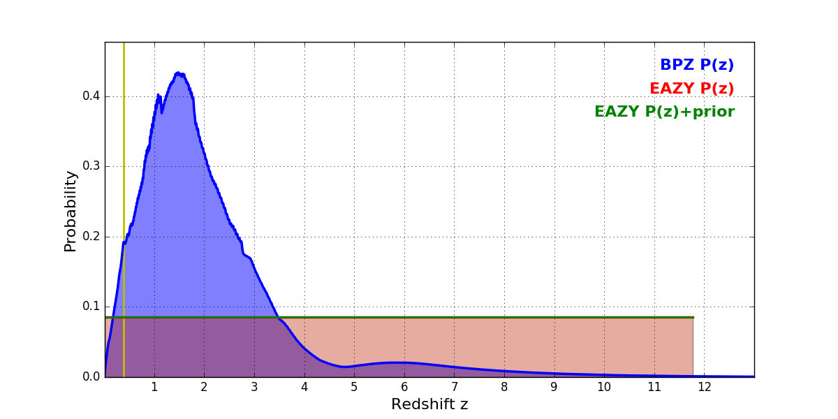 In P(z) plots: Yellow lines mark the cluster redshift z = 0.390,