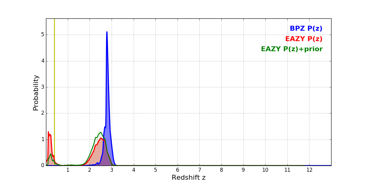 In P(z) plots: Yellow lines mark the cluster redshift z = 0.390,