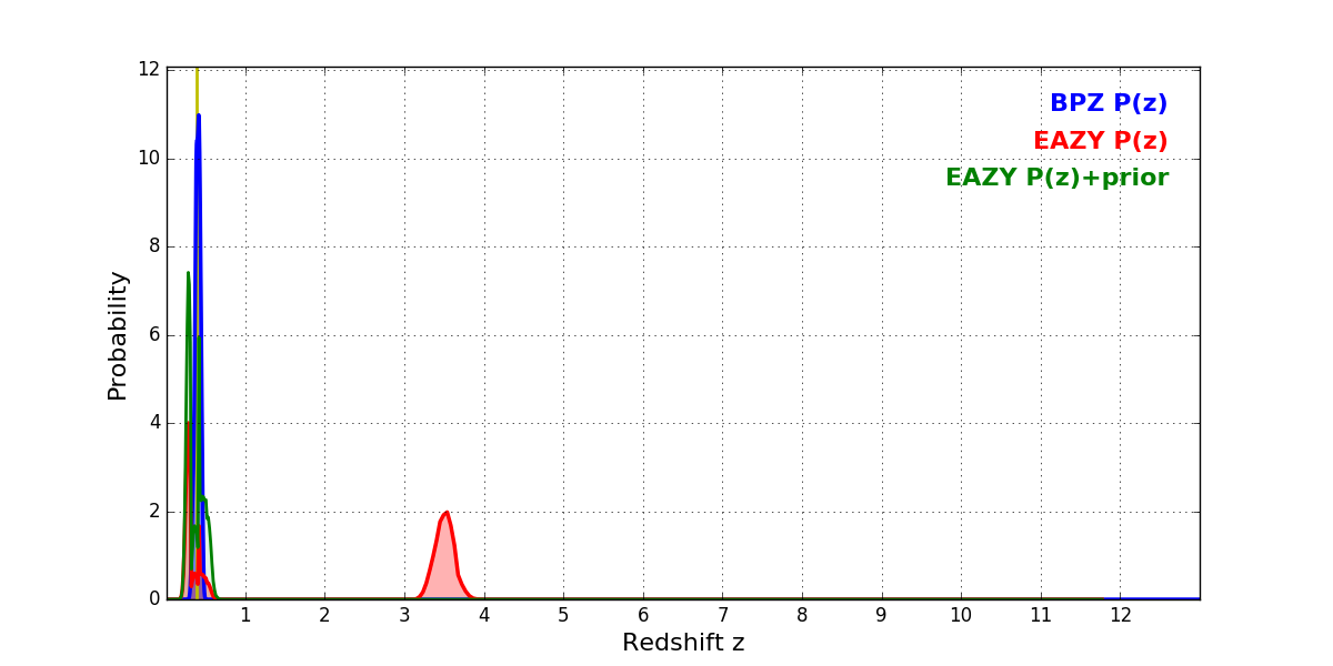 In P(z) plots: Yellow lines mark the cluster redshift z = 0.390,
