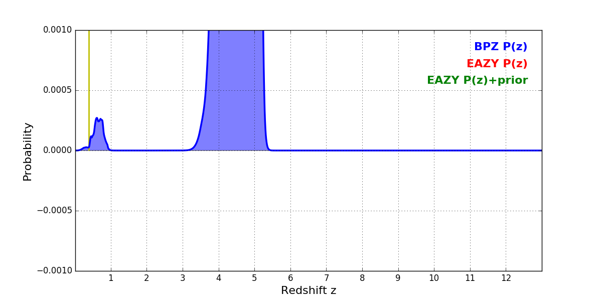 In P(z) plots: Yellow lines mark the cluster redshift z = 0.390,