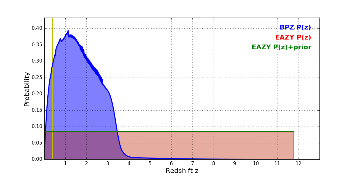 In P(z) plots: Yellow lines mark the cluster redshift z = 0.390,