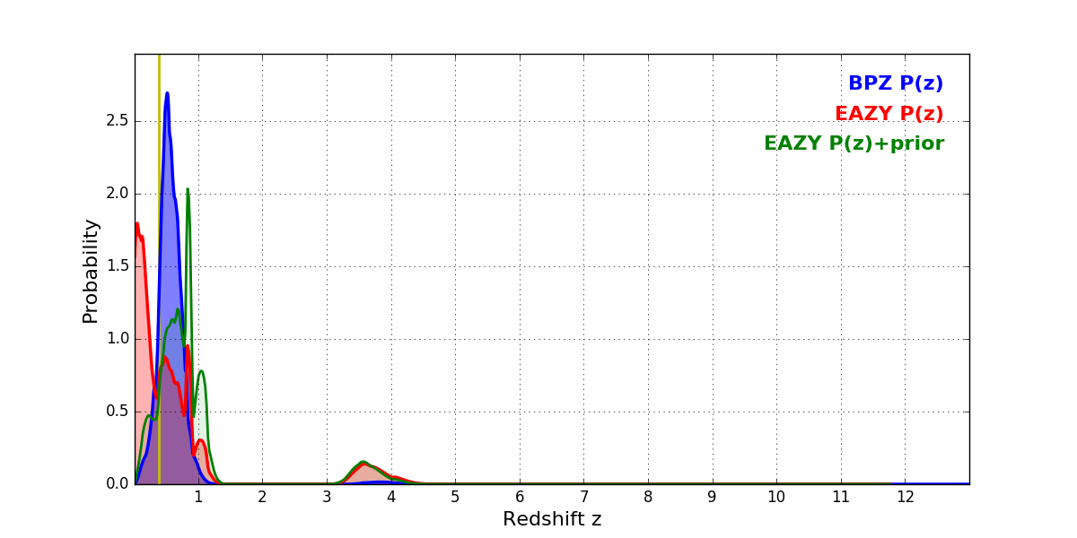 In P(z) plots: Yellow lines mark the cluster redshift z = 0.390,