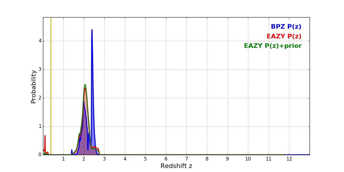 In P(z) plots: Yellow lines mark the cluster redshift z = 0.390,