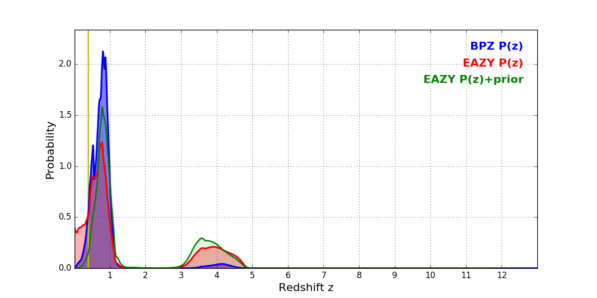 In P(z) plots: Yellow lines mark the cluster redshift z = 0.390,