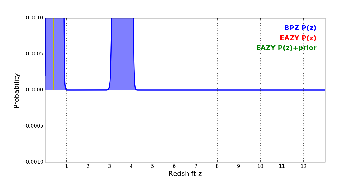 In P(z) plots: Yellow lines mark the cluster redshift z = 0.390,
