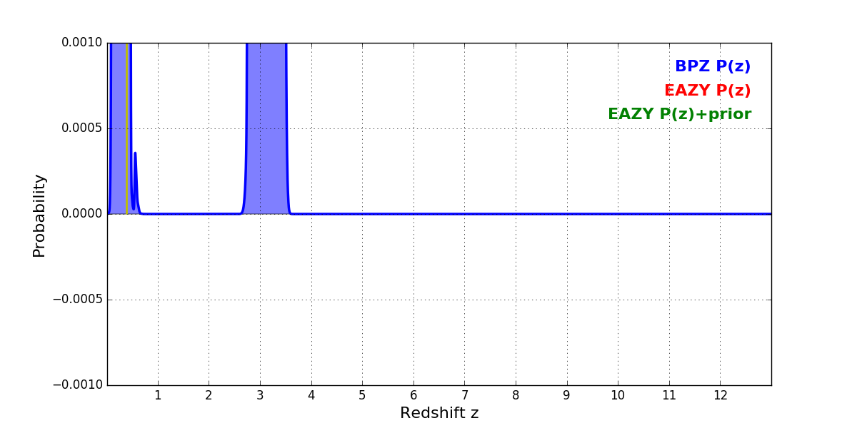 In P(z) plots: Yellow lines mark the cluster redshift z = 0.390,