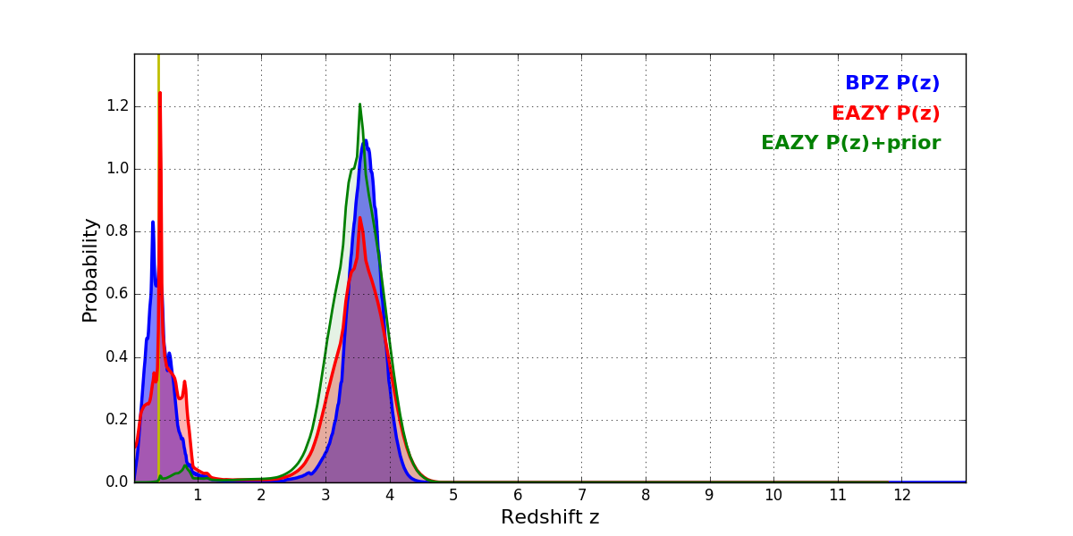 In P(z) plots: Yellow lines mark the cluster redshift z = 0.390,