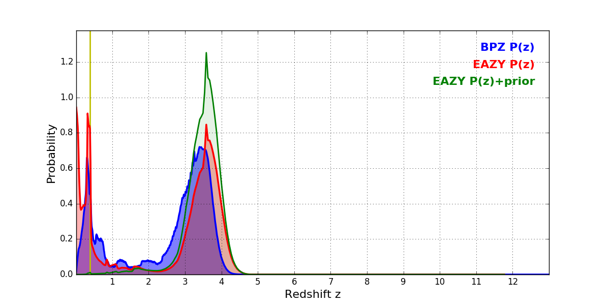 In P(z) plots: Yellow lines mark the cluster redshift z = 0.390,