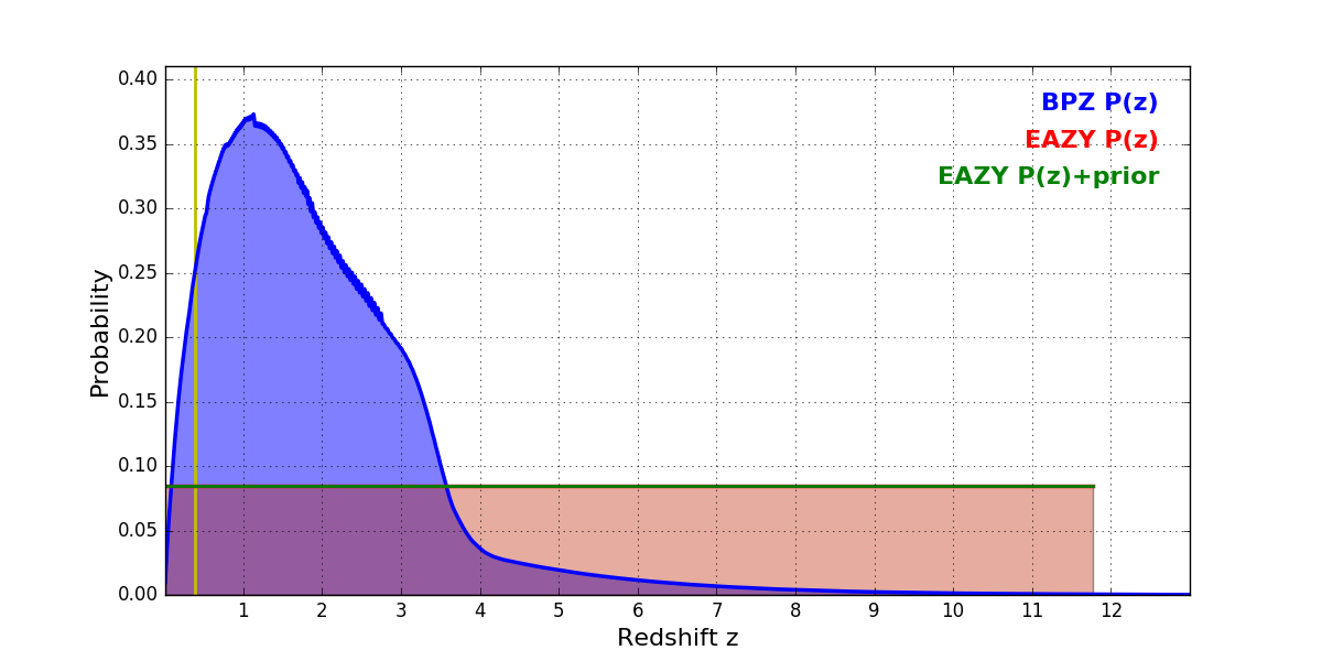 In P(z) plots: Yellow lines mark the cluster redshift z = 0.390,