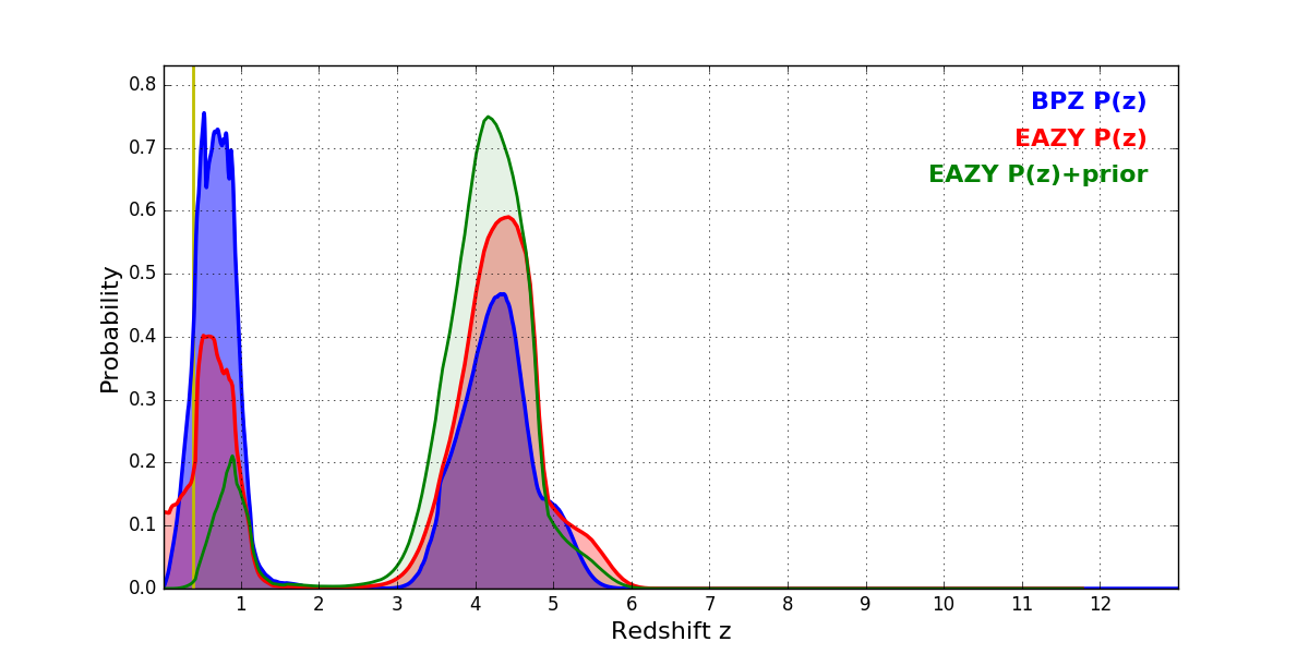 In P(z) plots: Yellow lines mark the cluster redshift z = 0.390,