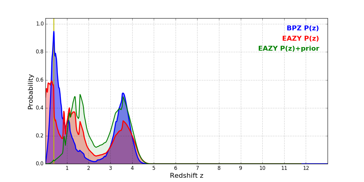 In P(z) plots: Yellow lines mark the cluster redshift z = 0.390,