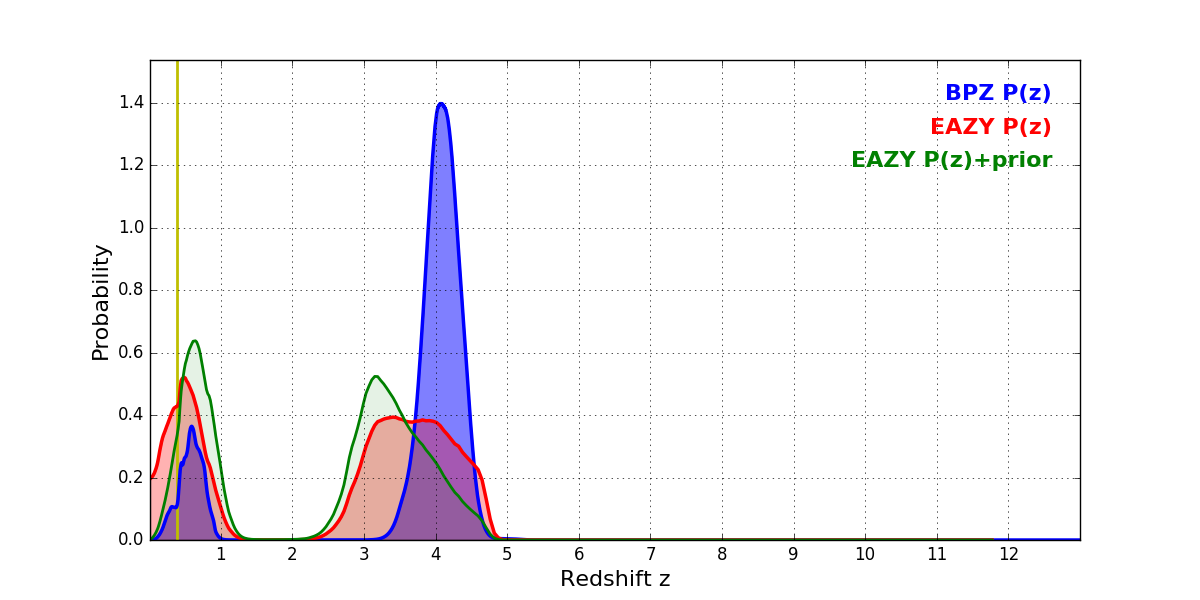 In P(z) plots: Yellow lines mark the cluster redshift z = 0.390,