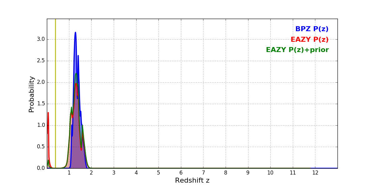 In P(z) plots: Yellow lines mark the cluster redshift z = 0.390,