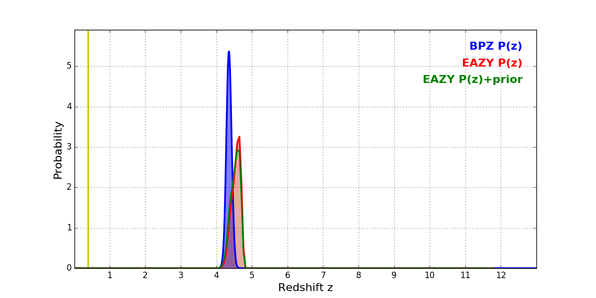 In P(z) plots: Yellow lines mark the cluster redshift z = 0.390,