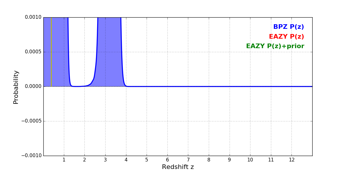 In P(z) plots: Yellow lines mark the cluster redshift z = 0.390,