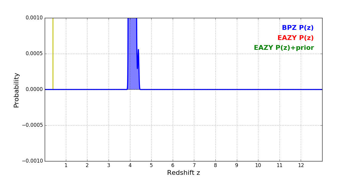 In P(z) plots: Yellow lines mark the cluster redshift z = 0.390,