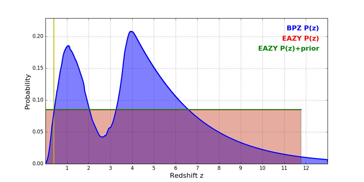In P(z) plots: Yellow lines mark the cluster redshift z = 0.390,