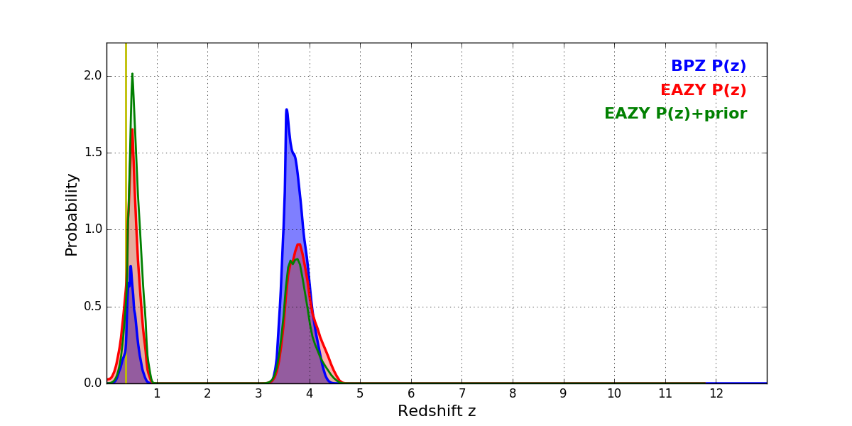 In P(z) plots: Yellow lines mark the cluster redshift z = 0.390,