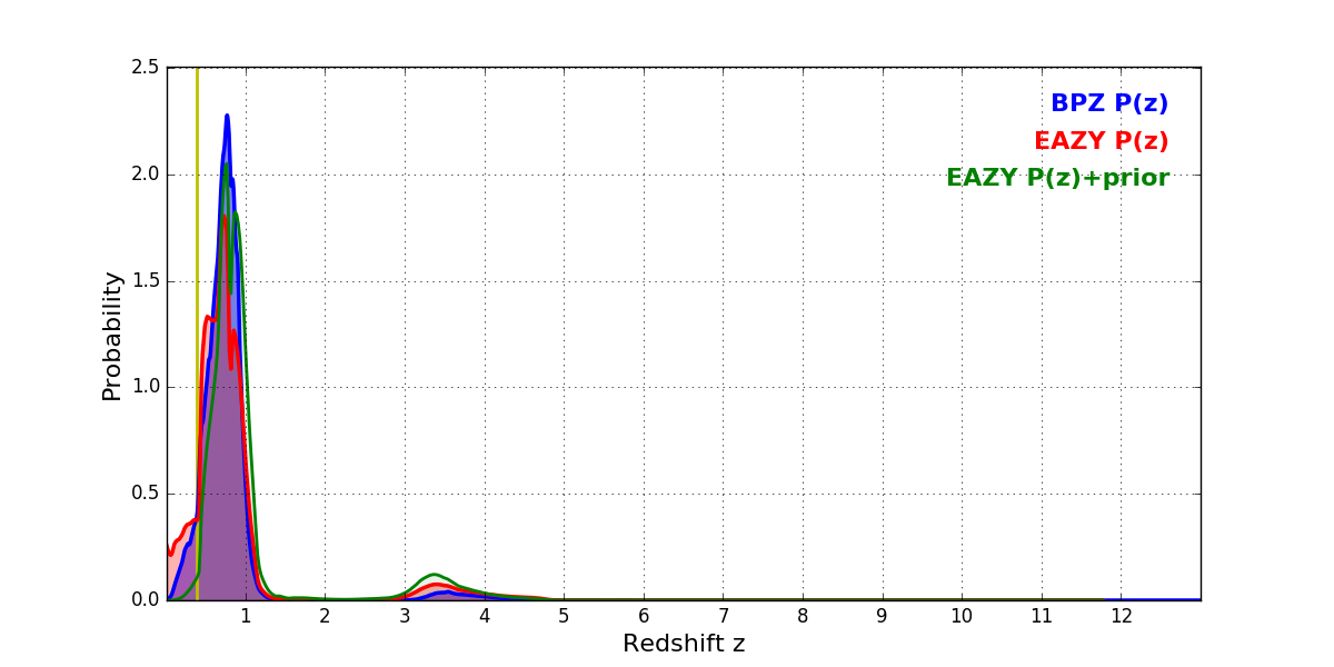In P(z) plots: Yellow lines mark the cluster redshift z = 0.390,