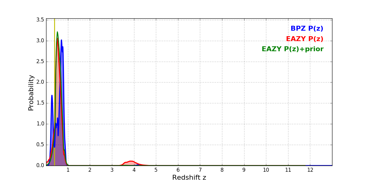 In P(z) plots: Yellow lines mark the cluster redshift z = 0.390,