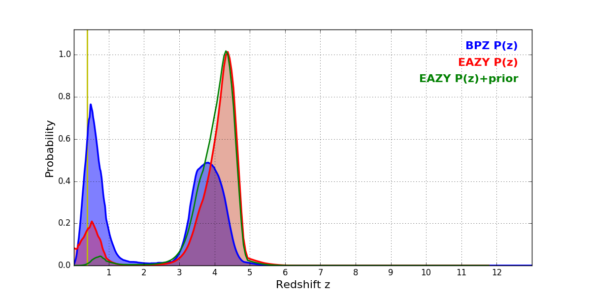 In P(z) plots: Yellow lines mark the cluster redshift z = 0.390,