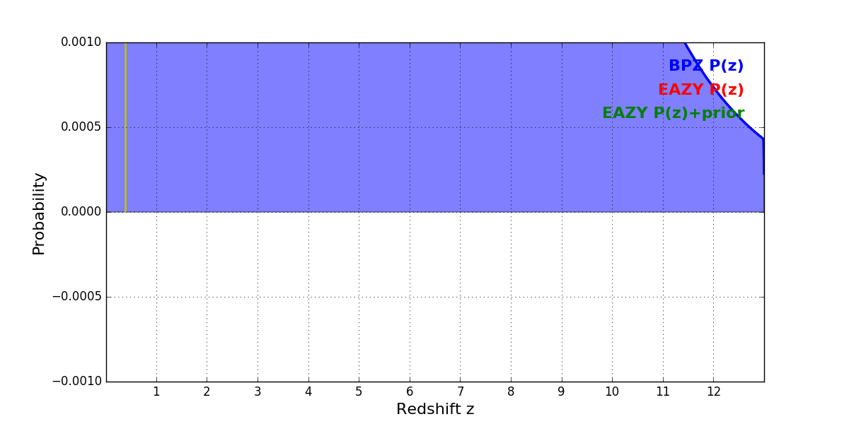 In P(z) plots: Yellow lines mark the cluster redshift z = 0.390,
