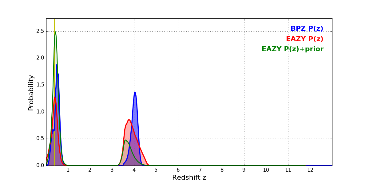 In P(z) plots: Yellow lines mark the cluster redshift z = 0.390,