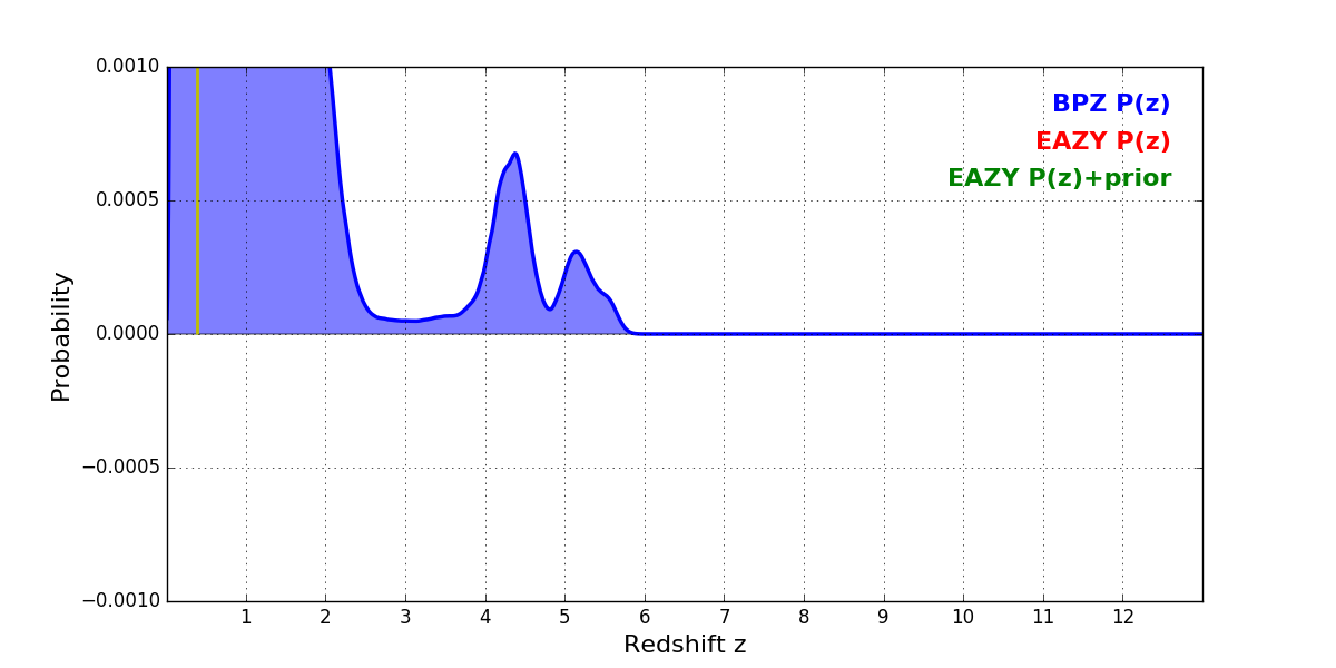 In P(z) plots: Yellow lines mark the cluster redshift z = 0.390,